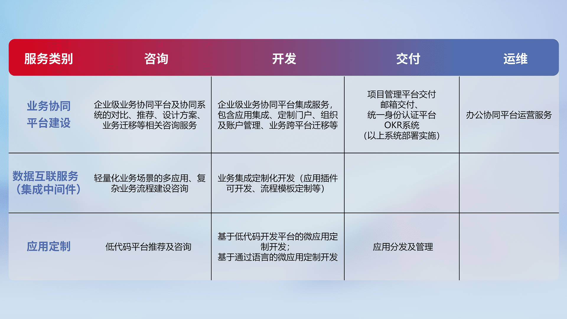 针对钉钉、、企微、、IDaas等平台级产品提供产品的规划、、、、方案、、交付、、、定制化开发等服务,,实现如统一协同办公、、智能客户服务、、、混合会议管理、、、智能数据查询、、、、等业务场景,,,,实现数字化转型。。。。
